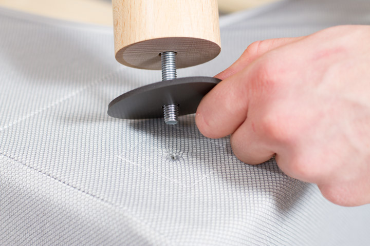 IMPORTANT: Use only solid, round legs with a diameter between 55-65 mm. The encasement can only be used when the bed has corner leg attachments without thread where the leg is fastened with a bolt from the inside (see instructions).